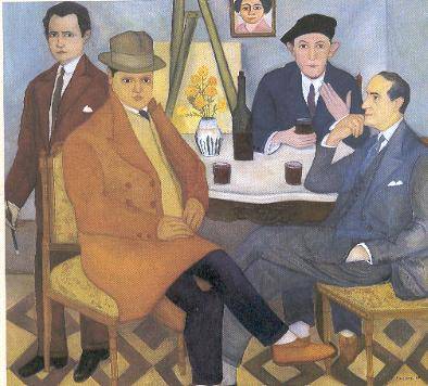 El cuadro gigante "con los pintores amigos"(1930) lo resume junto a Musto, Guido y otro incierto. Con rombos fuera de escuadra en el piso rebatido, con pies fuera de lugar, el atril verde ocultando una tela, el retrato de una mujer interrumpido. El florero y Buen humor.